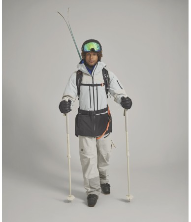 The stowaway bag can be completely opened up thanks to its circumferential zipper and is equipped with all of the features you need on a tour: Ski, splitboard, and rope attachments, an ice axe holder and small map compartment leave nothing to be desired. Emergency equipment can be stowed in a separate safety compartment. We have used particularly lightweight but scuff-resistant materials to keep weight down to a minimum.
